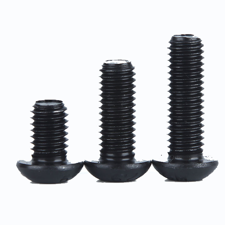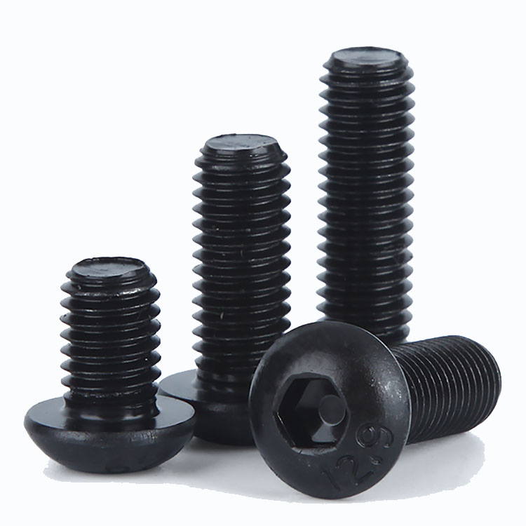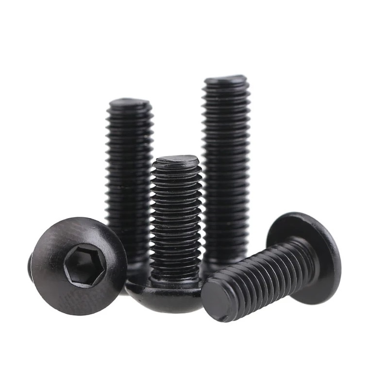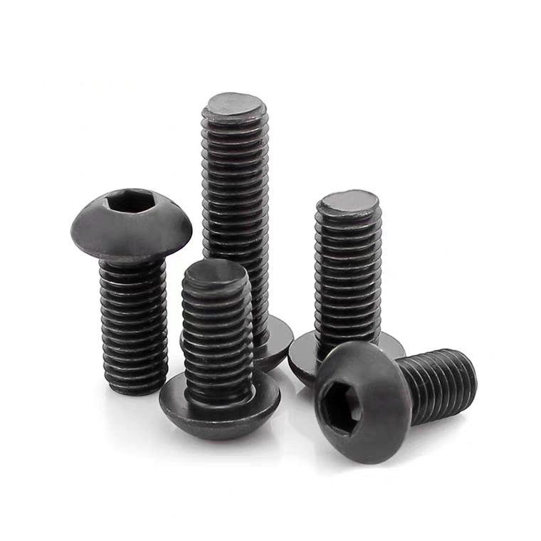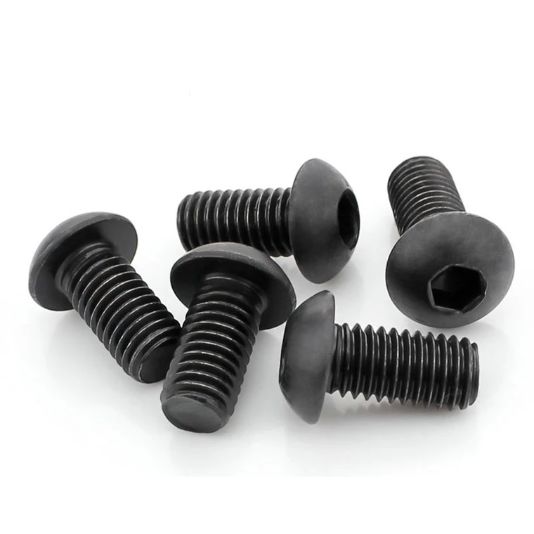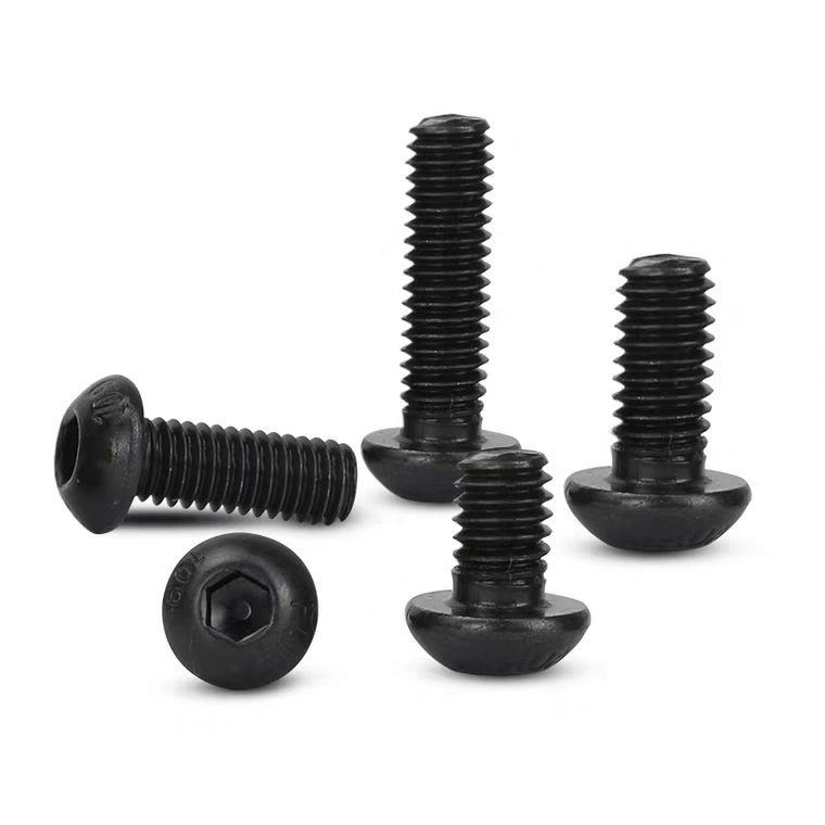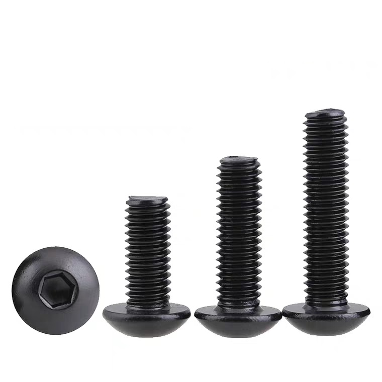 Śruby z łbem imbusowym ISO7380 z czarną powłoką oksydowaną to śruby z łbem zaokrąglonym i wewnętrznym gniazdem sześciokątnym. Wykonane ze stali węglowej (dostępnej w klasach wytrzymałości 4.8, 8.8, 10.9, 12.9), pokryte czarną powłoką oksydowaną tworzą odporną na zużycie, matową powierzchnię (idealną do redukcji odbić światła w maszynach). Zapewniają podstawową ochronę przed rdzą, jednak dla zwiększenia trwałości zaleca się regularne smarowanie. Zgodne z normą ISO7380, dostępne są w rozmiarach metrycznych od M2 do M16. Szeroko stosowane w maszynach (mocowanie matryc), urządzeniach przemysłowych (mocowania ukryte), elektronice (mocowania niskoprofilowe) oraz montażu mebli, łączą w sobie bezpieczeństwo mocowania i estetykę.